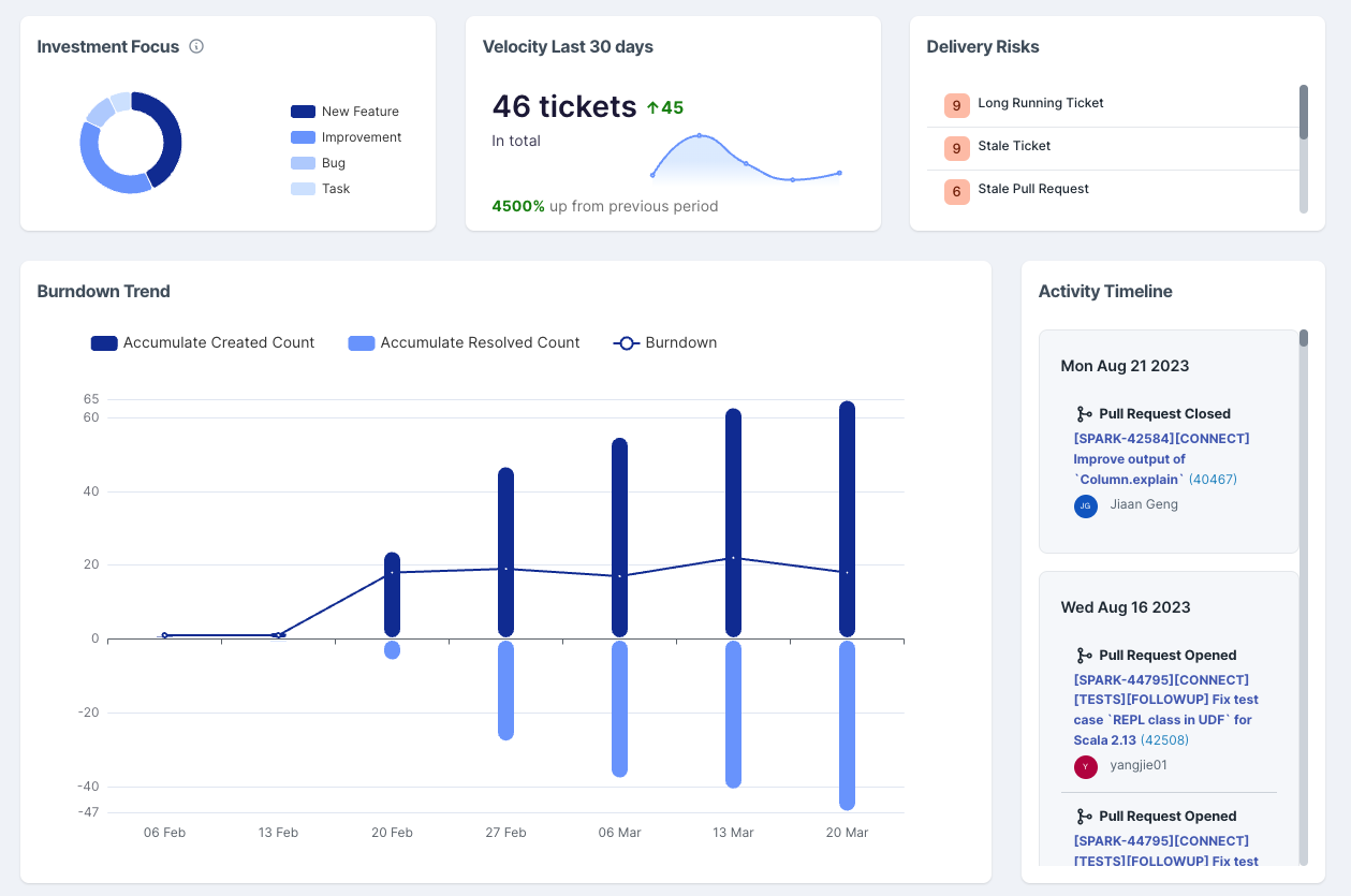 The below shows parts of an Epics Cockpit that break down the epic by its current investment focus based on labels, its velocity in delivering over time as well as risk factors on the tickets as well as their corresponding coding activities (PR) that have been automatically detected.